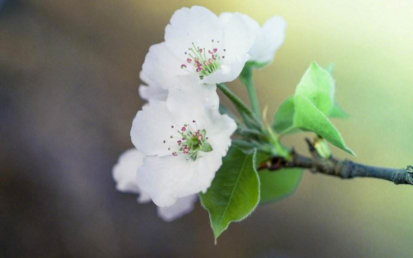 二十八、用不了十来天,那米粒般大小的嫩绿的小骨朵,就变成了一朵朵小花,淡白色的小花,中间有几点鹅黄的花蕊,花的底部衬着两片嫩绿的叶子,这就是一朵完整的梨花了。
