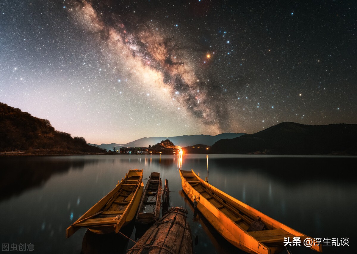 3、月亮坠入不见底的河,星星垂眸惊动了舸,于是成了满天星河。