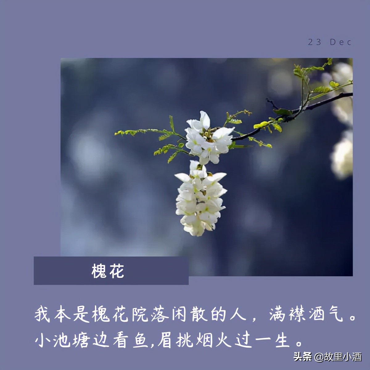 我本是槐花院落闲散的人,满襟酒气。小池塘边看鱼,眉挑烟火过一生。