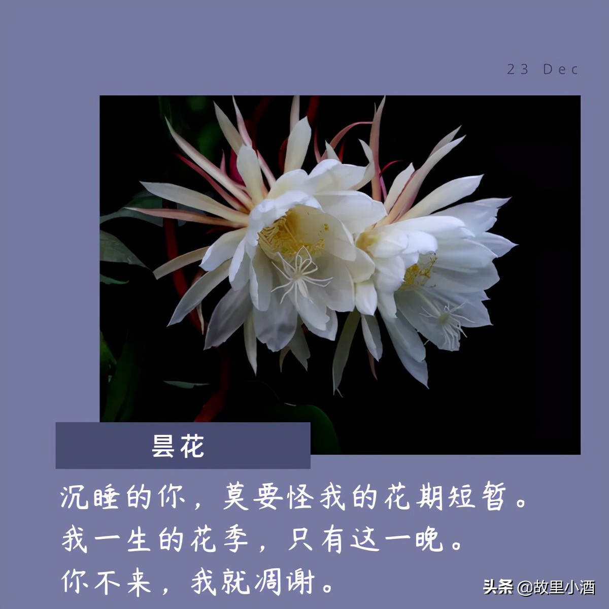 沉睡的你,莫要怪我的花期短暂。我一生的花季,只有这一晚。你不来,我就凋谢。