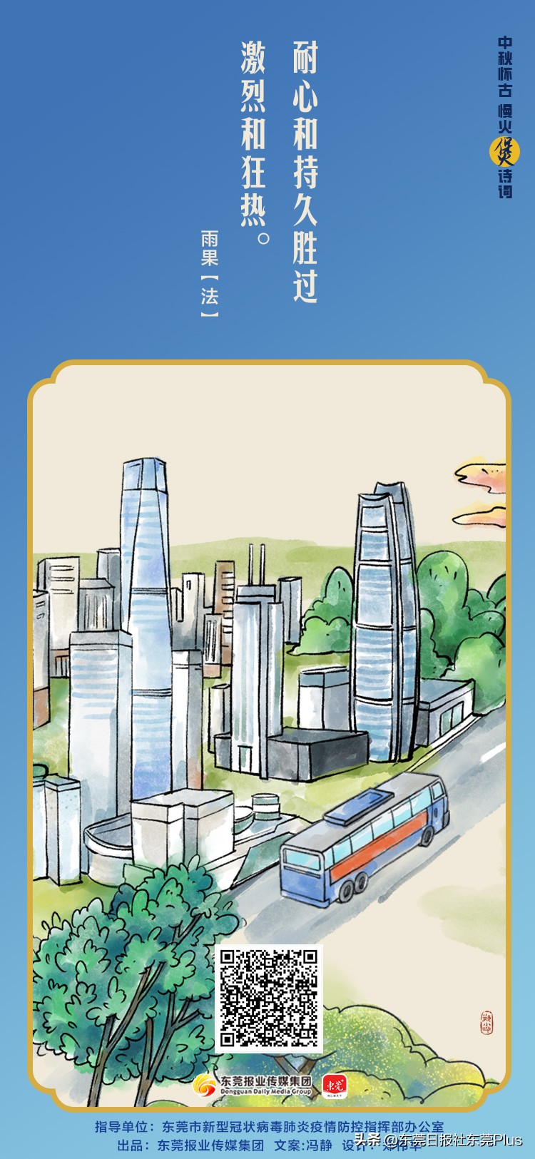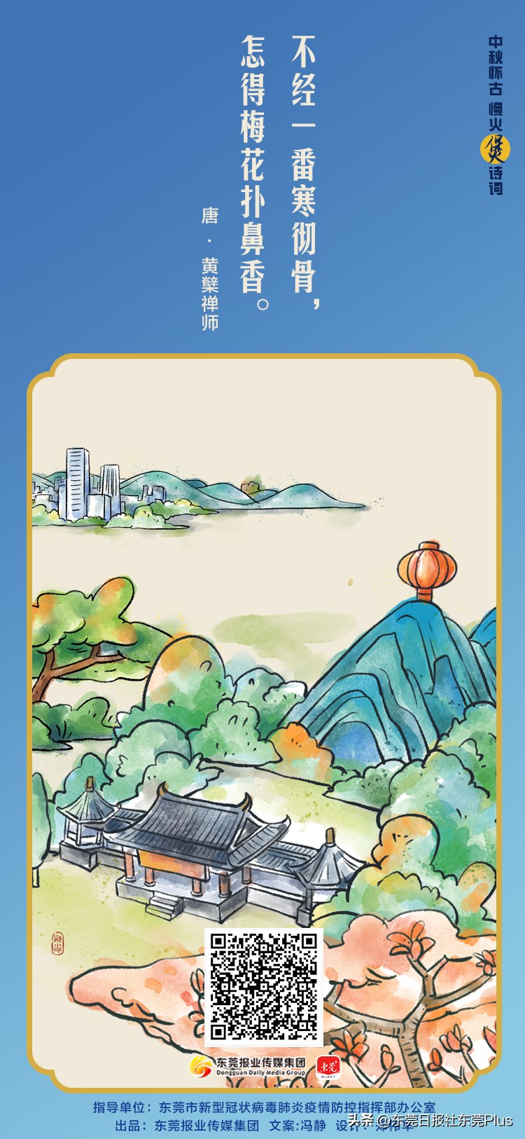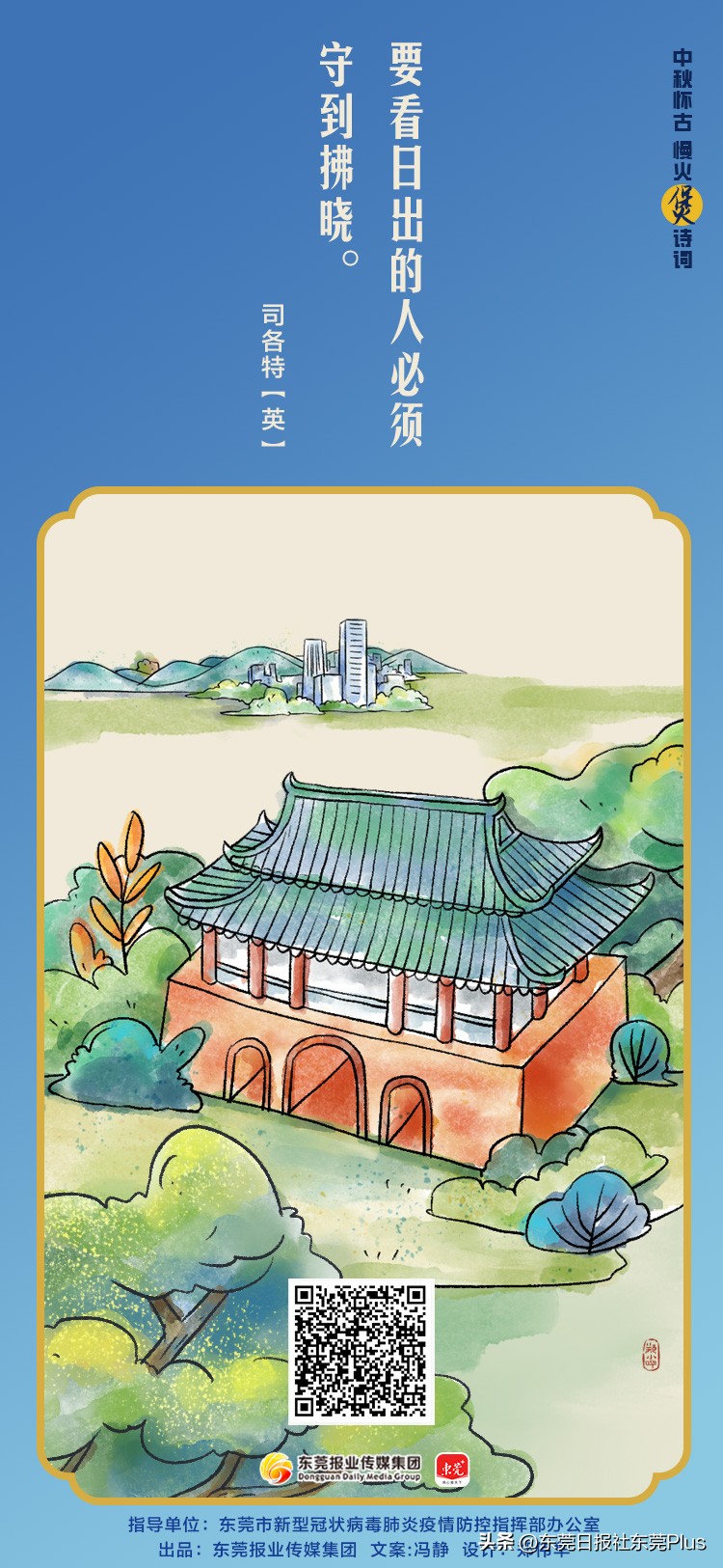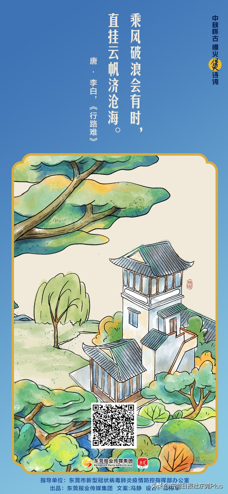 值此中秋佳节,在东莞市新型冠状病毒肺炎疫情防控指挥部办公室指导下,东莞报业传媒集团出品了“中秋怀古 慢火‘煲’诗词”系列海报,祝全市市民中秋快乐,阖家团圆,幸福安康。